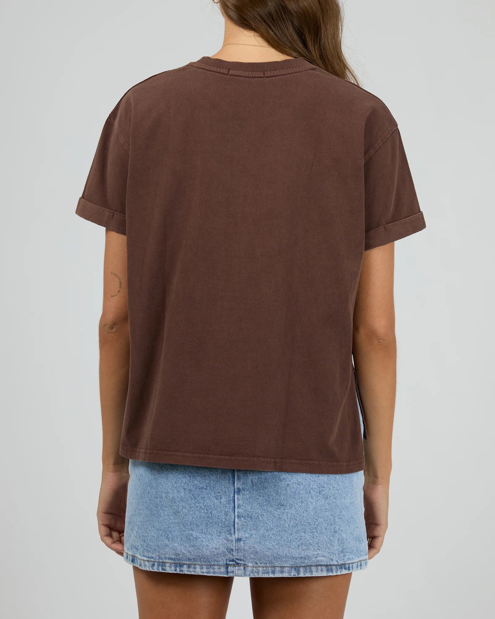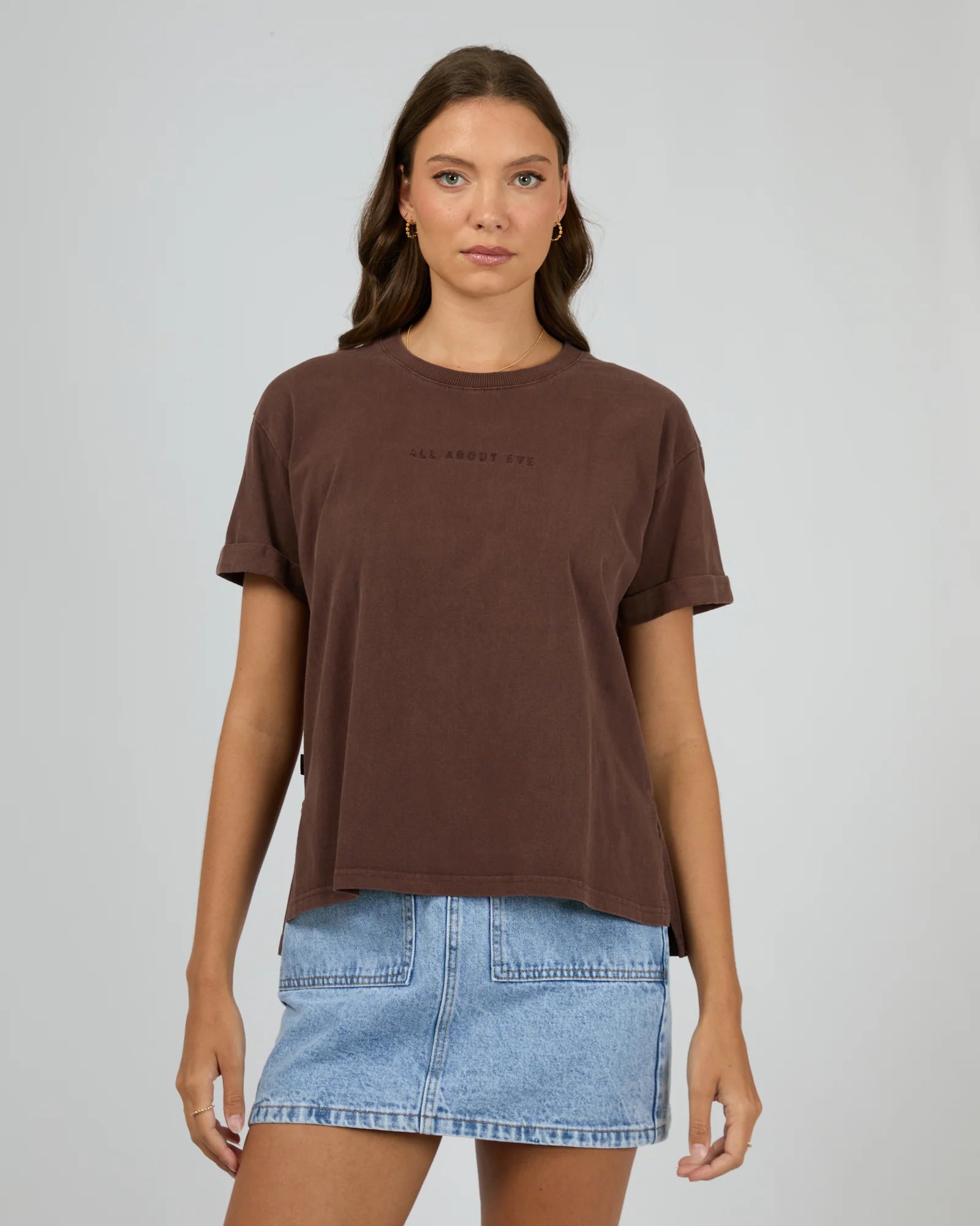 All About Eve Washed Tee features a garment wash with a branded chest embroidery. Styled back with denim jeans and sneakers for a chic weekend vibe.
