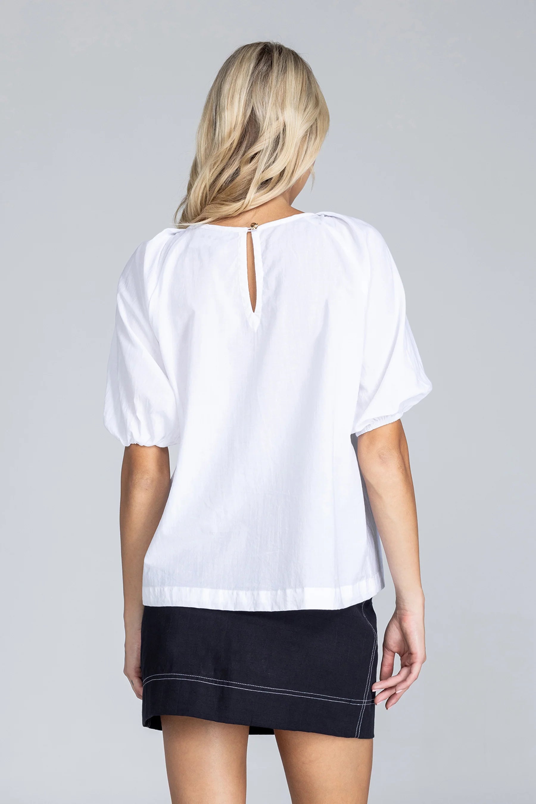 Airy, effortless, and just the right amount of feminine – The Only Light Top is your go-to for relaxed polish. Crafted from crisp white cotton, this blouse features delicate pin-tucks to frame the neckline with a stunning keyhole detail, voluminous puff sleeves, and an easy silhouette that skims the body. Whether tucked into a tailored trouser or worn loose with denim, it’s the kind of top that elevates even the simplest looks.
